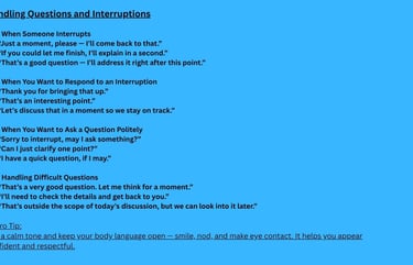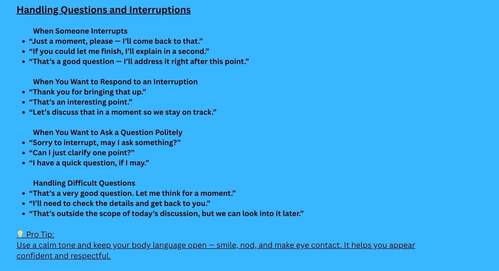 Even the best speakers get interrupted or asked questions. The key is to stay calm, polite, and in control of the discussion.
